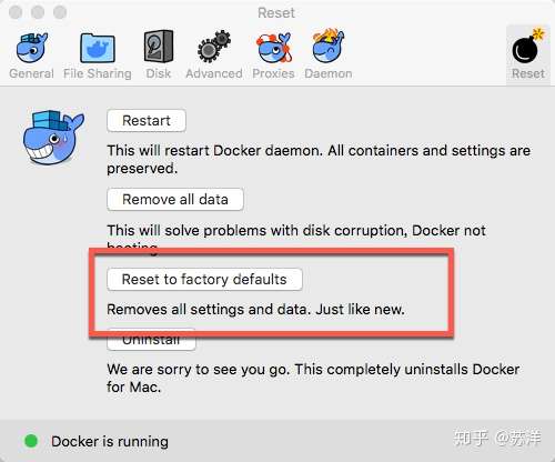 当然,我试验过最近两个版本的 Docker For Mac 使用界面按钮 Reset to factory default 重置数据也是极其有效的。